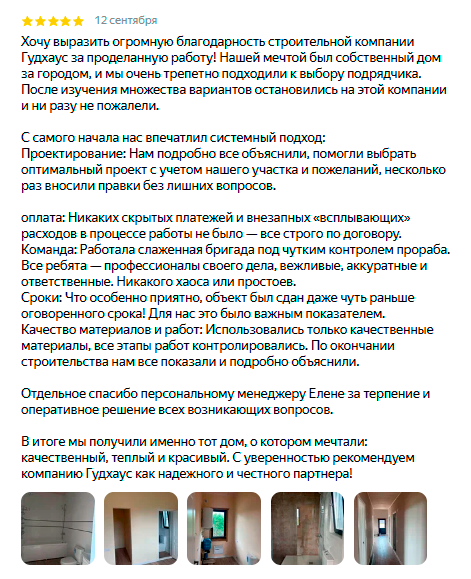 Моя принципиальная позиция — сделать качественное загородное жилье доступным. Именно поэтому мы в Гудхаус строим дома под заезд. По проверенной годами технологии и из правильных материалов. Следим за качеством строительства каждого объекта, даем гарантию.